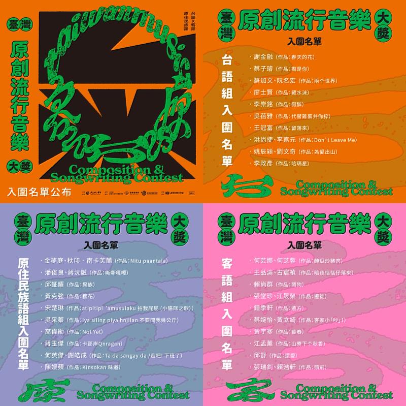 (中央社訊息服務20250728 17:09:10)由文化部影視及流行音樂產業局、原住民族委員會及客家委員會共同舉辦的114年臺灣原創流行音樂大獎,共計242件作品參賽,包含台語組131件、客語組47件、原住民族語組64件,經過3個多月的初審、複審作業,日前公布入圍名單(如下)。