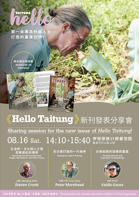 為了讓在臺灣的外籍人士能夠更深度地了解臺東的多元文化及生活,臺東縣政府創辦了專為外籍人士量身打造的外語刊物《Hello Taitung》,一年發行兩期,每期選擇一個主題,邀請居住臺東的外籍朋友們,撰文分享臺東生活的真實樣貌。最新一期主題為:「Nurture in Taitung 與臺東互相滋養」,台東縣政府將於16日下午2時30分在伊塔原旅 臺東縣原住民文化會館舉辦新刊分享會,這期新刊將深入探討不同形式的滋養如何在臺東這片土地上生根發芽,並創造更多美好的可能,歡迎鄉親前往參與