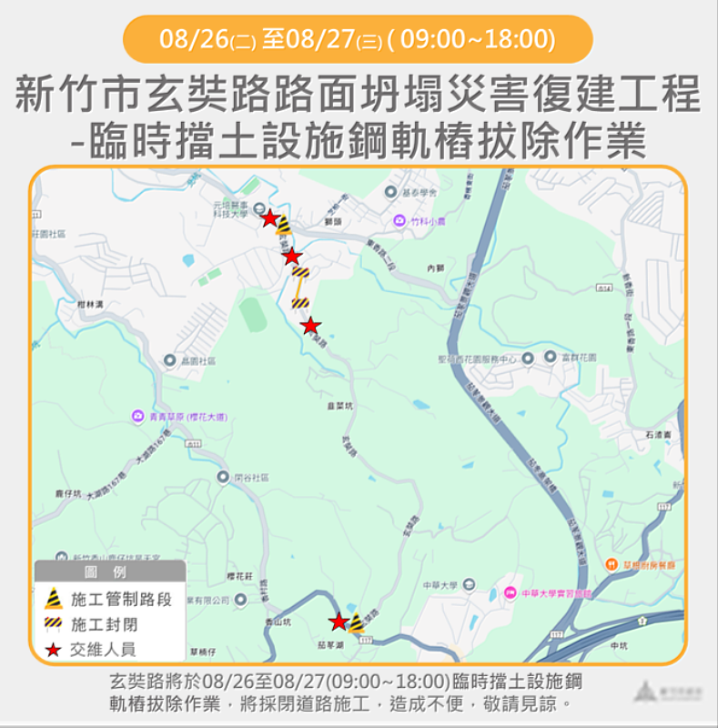 竹市玄奘路8/26至8/27辦理鋼軌樁拔除作業 市府提醒用路人遵循交管指引