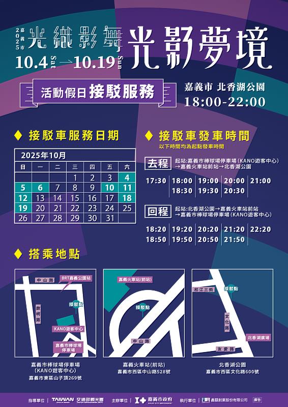 (中央社訊息服務20250927 09:28:48)「2025嘉義市光織影舞」將於10月4日至10月19日在北香湖公園盛大登場。嘉義市政府為方便民眾前往欣賞光影藝術展,特別規劃交通接駁專車,於10月4日至6日、10月10日至12日,以及10月18日至19日行駛,串連嘉義市棒球場停車場(KANO遊客中心)、嘉義火車站前站與北香湖公園,提供安全、便利又環保的交通選擇,邀請全國民眾搭乘大眾運輸,輕鬆暢遊光影盛宴。