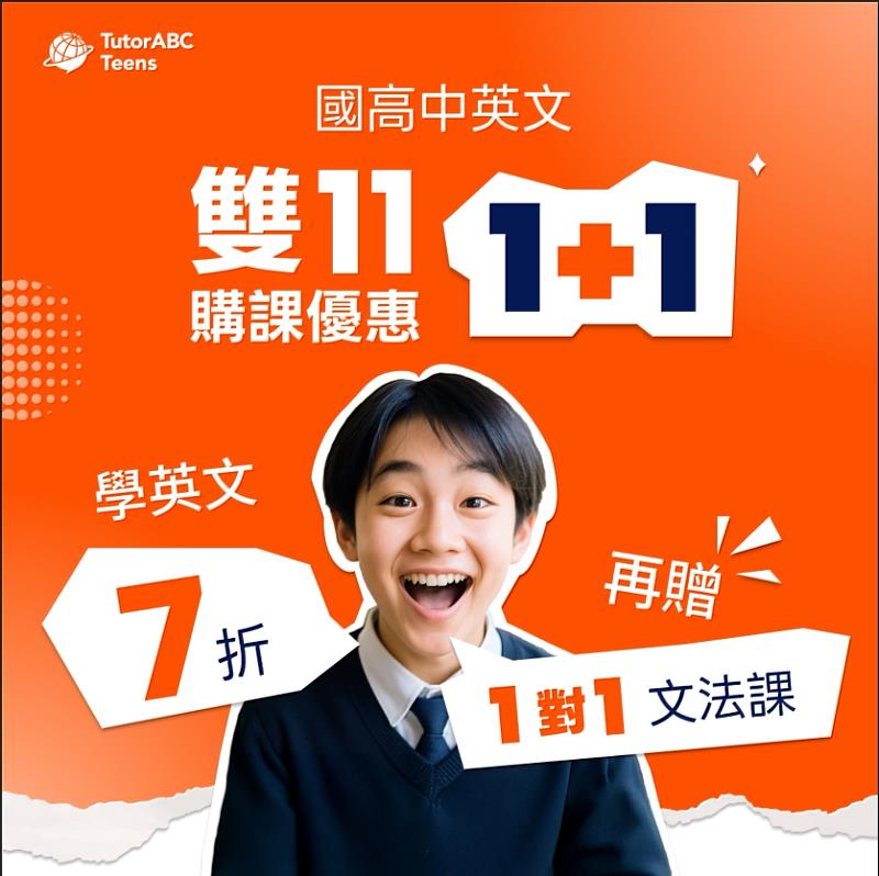 因應此現象,線上國高中英語學習領導品牌TutorABC Teens宣布,本月底前購買指定課程享雙11期間7折優惠外,再享免費「1對1學測衝刺班」,助力學生戰勝大學申請備考。