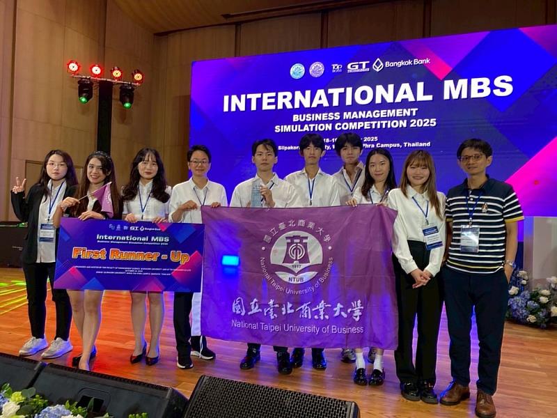 (中央社訊息服務20251121 16:03:40)國立臺北商業大學在泰國Silpakorn University(泰國藝術大學)主辦的「2025 International MBS Business Management Simulation Competition」中脫穎而出,由北商大代表隊NTUB NPV MAX奪下亞軍(First Runner-Up),成為本屆唯一進入前3名的臺灣隊伍,展現北商大在企業決策與國際化人才培育的深厚能量。