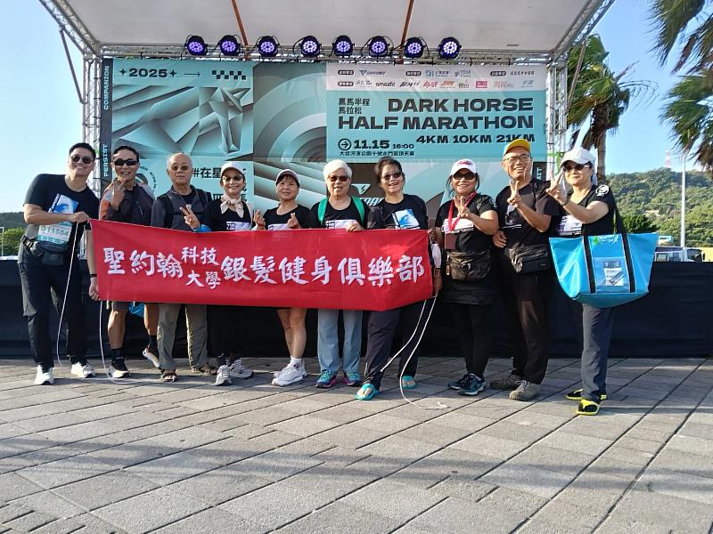 聖約翰科技大學銀髮健身俱樂部組隊參加「2025 黑馬半程馬拉松」,共動員13位銀髮學員與教練參與,其中4人挑戰10公里組,9 人參加4公里組,成員加起來年齡突破千歲,堪稱實至名歸的「千歲跑團」。在兩位教練盧詩淇與吳家祥的帶領下,大家以穩健步伐與成熟跑者風範,平安順利完賽,展現樂齡族群依然可以自信奔跑的活力姿態。