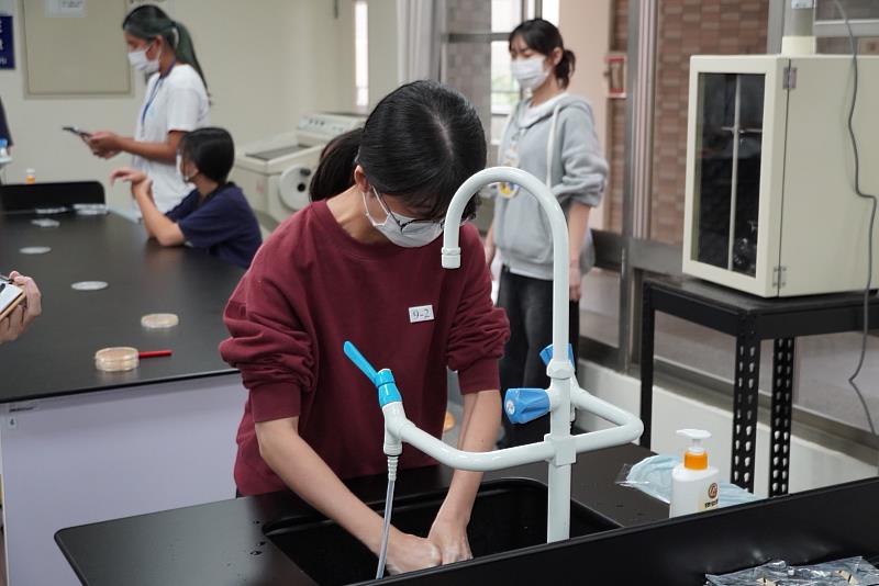 這項由第16屆護理科科學會主辦的年度競賽,核心宗旨是深化學生對專業洗手的重視,並將課堂理論確實轉化為臨床行為。最特別的是,競賽融入實證精神,參賽者完成洗手後,需以三指指腹按壓培養皿,藉此觀察手部清潔效果。這種方式讓學生能親眼看見不同洗手品質所帶來的細菌滋生差異,將抽象的感染控制概念具體化,大幅強化了學習印象與專業態度。
