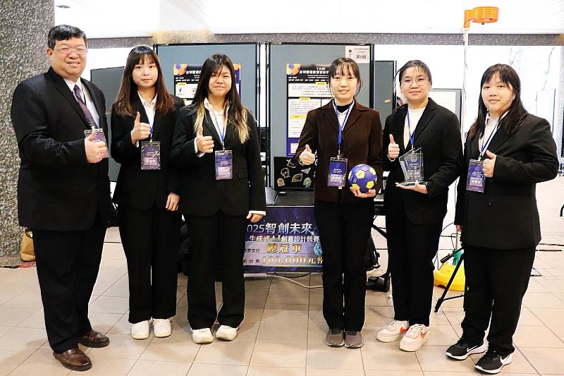 資工系本次有16組作品參展,其中有10組專題成果投稿各項競賽,共獲8個獎項。其中,謝萬雲主任指導高滕暄、王奕辰、林智媛、廖羽暄、林宜臻同學,以「TASK─『合球』體適能智慧教學輔助系統」為題,在亞洲大學舉辦的「2025生成式AI創意設計競賽」摘下總冠軍,贏得10萬元獎金。