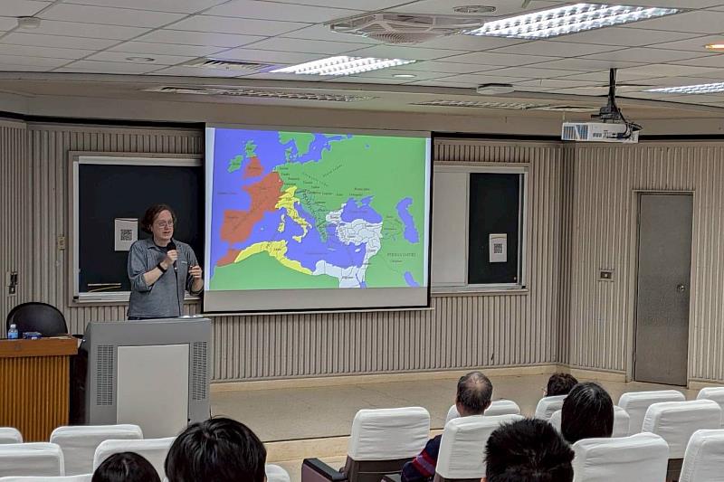 講座開場,蘇費翔教授先以德國最古老城市特里爾為引言,介紹當地歷史與文化景觀,並說明特里爾大學雖座落於古城,卻是一所年輕而充滿活力的大學,展現獨特的學術氛圍。隨後,他進一步說明德國漢學教育的發展現況,指出德國各校漢學系培育方式並不一致,呈現多元且分散的樣態。他也強調,理解臺灣不能只從歷史切入,同樣需要掌握社會運作的脈絡;雖然德國漢學系學生人數有限,但整體中文能力普遍扎實,顯示其長期訓練的成果。