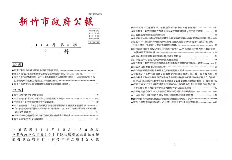 行政處表示,第6期市政公報除刊載前述四項法規外,亦收錄地政士開業、不動產經紀人證照核發與註銷、環保案件催繳書、道路廢棄車輛公示送達,以及國立新竹高商日式宿舍群暫定古蹟期限延長等多項行政公告,涵蓋地政、環保、文化與交通等領域。同時,此次亦預告多項法規修正草案,包括「新竹市環境教育基金收支保管及運用辦法」、「新竹市公園管理自治條例收支保管及運用辦法」及「新竹市政府停車管理處設置辦法」等,讓市民得以提前了解政策研擬方向,展現市府持續在文化服務、公共治理、環境管理及弱勢支持等面向精進努力。