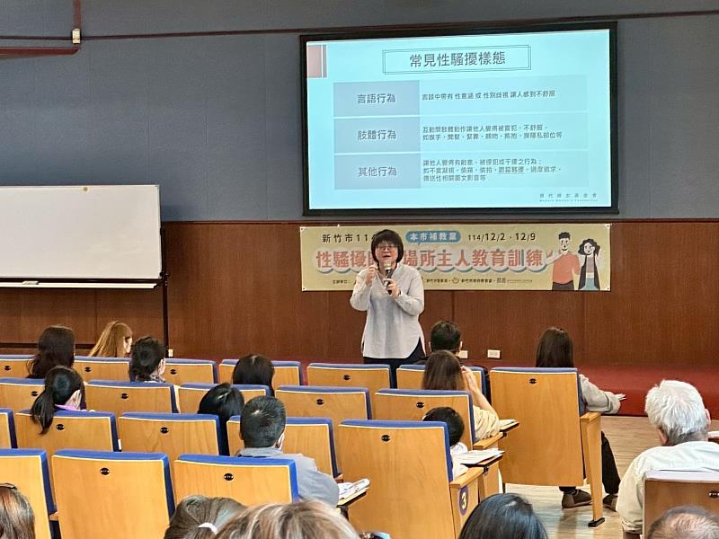 社會處長黃佳婷表示,為落實場所主人法定防治責任,提升場所主人遇到性騷擾事件的處理能力,社會處在今(114)年12月上旬,已辦理3場次的「性騷擾防治場所主人教育訓練」,邀請竹市百貨公司、超級市場、旅宿業、補教業、長照、社福機構、醫院、諮商所、飲酒店業、運動場館業、民俗調理及按摩業等業者代表共計360人次參加。講師們透過生動活潑的課程講授方式,與學員們分享與討論案例,讓各行業場所主人在輕鬆互動中學習防治觀念,了解如何在日常生活中對抗與處理性騷擾事件,為營造安全友善的生活環境盡一份心力。