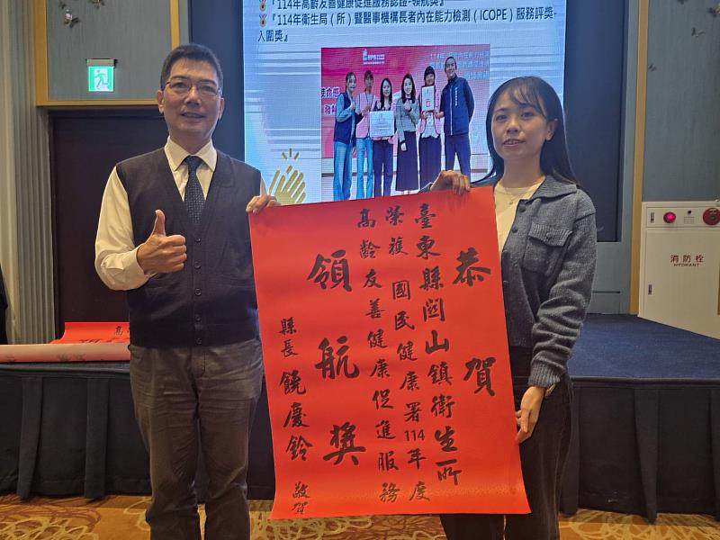 臺東縣關山鎮衛生所推動高齡友善健康照護成效卓著,榮獲衛生福利部國民健康署頒發「114年高齡友善健康促進服務認證-領航獎」及「長者內在能力檢測服務評獎-入圍獎」兩項殊榮,臺東縣衛生局長孫國平於19日頒發紅榜表揚關山鎮衛生所,肯定推動長者內在能力(ICOPE)評估、整合在地資源及打造友善高齡健康照護環境的亮眼成果,展現邁向友善高齡健康城市具體實績。