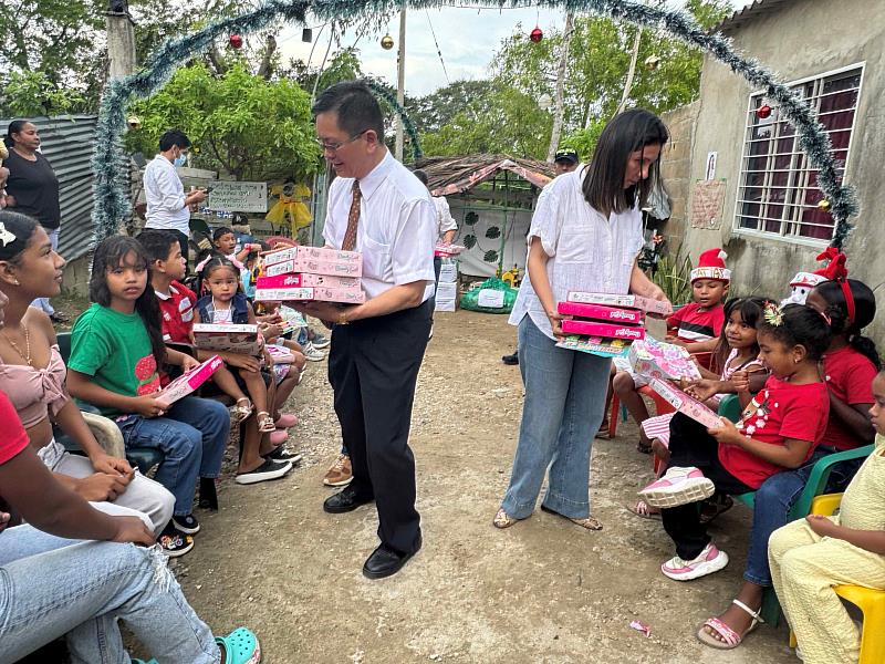 (中央社訊息服務20251222 08:56:02)駐哥倫比亞代表朱盛鴻於12月19日在眾議員哈羋蕾(Milene Jarava)的全程陪同下,前往北部加勒比海沿岸蘇克雷省(Sucre)省會捐贈聖誕物資給當地三個最貧困鄰里的幼童,帶來無限溫暖與希望,受贈兒童臉龐洋溢著幸福的歡樂。