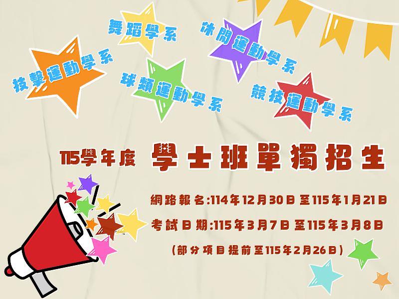 臺灣體大115學年度學士班單獨招生考試將開放報名 歡迎熱愛運動學子踴躍報考