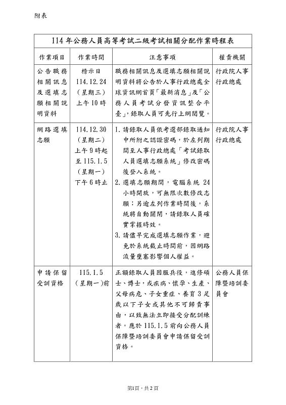 人事行政總處表示,本次分配作業重要事項及時程如下(詳如附表):