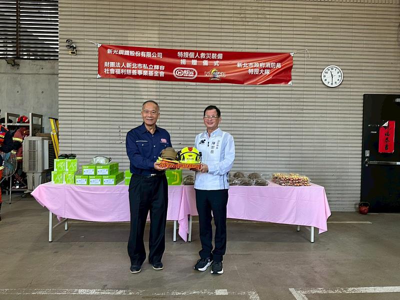 (中央社訊息服務20251224 15:20:44)新北市政府消防局於114年12月24日(星期三)上午11時於本局特搜大隊辦理「新光鋼鐵股份有限公司及財團法人新北市私立輝容社會福利慈善事業基金會聯合捐贈個人防護裝備典禮」,由消防局陳崇岳局長主持,此次捐贈70套個人防護裝備,將大幅提升特搜人員執行任務時的安全性與效能,也象徵民間力量與消防機關攜手守護城市安全的深厚情誼。