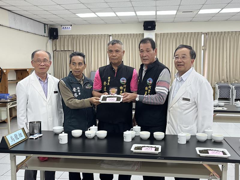 (中央社訊息服務20251224 17:52:38)嘉義縣阿里山鄉農會辦理2025阿里山冬季高海拔優良茶競賽,繳茶點數總共533點,包括青心烏龍組385點及金萱茶組148點參賽,由茶改場副場長邱垂豐、前茶改場魚池分場長郭寬福進行評審,今(24)日宣布得獎名單,烏龍組及金萱組特等獎分別由邱詩富與陳逸謙獲獎。