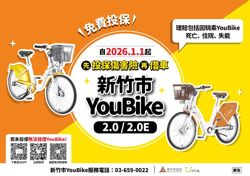 (中央社訊息服務20251224 18:03:13)新竹市政府持續完善公共自行車服務與騎乘安全,目前全市已設置115處YouBike 2.0站點,累計騎乘人次突破1,000萬,平均每月使用量約18萬人次。交通處表示,市府自114年4月1日起已率先實施YouBike 2.0E電輔車租借須投保公共自行車傷害險,並將於115年1月1日起擴大適用至YouBike 2.0一般車款,全面提升騎乘保障,守護市民用車安全。