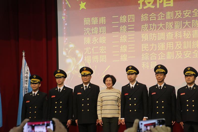 饒慶鈴首先為5位消防同仁授階,她指出,授階不僅象徵職務上的晉升,更代表肩負起更重要的使命與責任,接下來一一表揚年度績優消防與義消代表,感謝義消夥伴長年與消防人員並肩作戰,在救災、救護與防災宣導工作中發揮關鍵支援力量,肯定其守護縣民生命與財產安全的努力與付出。