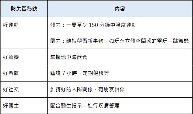 雖然早期發現、早期治療的效果最佳,但陳亮恭表示,最好還是要能預防失智,經過在台灣蒐集1,400位自覺腦力衰退的高齡者案例後,印證做好5件事,有助腦力提升,一是好運動,包括身體與腦力,建議一周至少要有150分鐘中強度運動,維持學習新事物的習慣,連玩有立體空間感的電玩、跳舞機,都被證實有訓練效果;二是好營養,例如地中海型飲食;三是好習慣,如睡夠7小時、定期健檢等;四是好社交,維持好的人際關係、有朋友相伴;五是好醫生,即配合醫生指示,進行疾病管理,長期做好5件事,就連75歲高齡者都證明有助腦力進步。