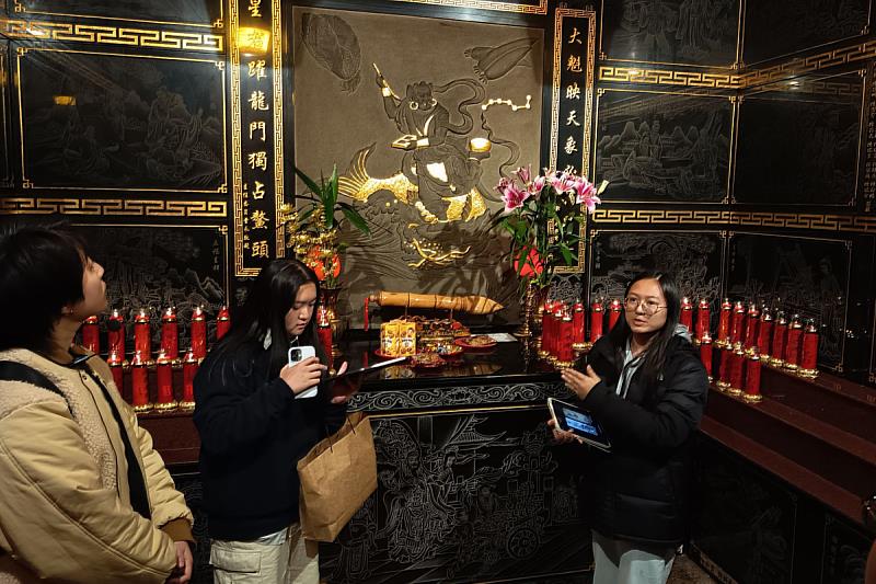 走讀路線從海港大樓出發,途經海洋廣場、城隍廟、慶安宮、初見咖啡,最終於至善大樓頂樓進行星空觀測。透過天文專家歐柏昇與曾美茵的指導,海大天文社將基隆文史脈絡與星空系統進行跨領域轉譯。天文社幹部陳宥瑄同學與王以真同學於慶安宮現場分別介紹太歲、北斗、南斗、文昌與魁星等神祇與天文對應,讓參與者看見廟宇文化中存在的星象系統與宇宙觀,也展現出學子在文化詮釋、知識轉譯與導覽能力上的成長。