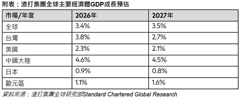 (中央社訊息服務20260115 11:24:59)渣打集團全球研究部發布最新經濟展望報告,預估2026年全球經濟將維持3.4%的穩健成長,與2025年持平;渣打集團並上調今(2026)年台灣GDP成長預測至3.8%,主要受惠於全球人工智慧(AI)需求強勁、提前出貨效應,以及消費復甦持續回升,驅動整體成長。