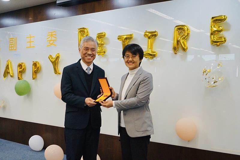 (中央社訊息服務20260115 18:31:29)客家委員會今(15)日於會內舉辦「范佐銘副主任委員榮退歡送茶會」,由主任委員古秀妃親自頒發行政院「特等服務獎章」、「一等功績獎章」,並致贈紀念品予范副主委,感謝其在客委會服務期間的貢獻與付出。茶會在客委會全體同仁的祝福下溫馨進行,並留下珍貴合影。