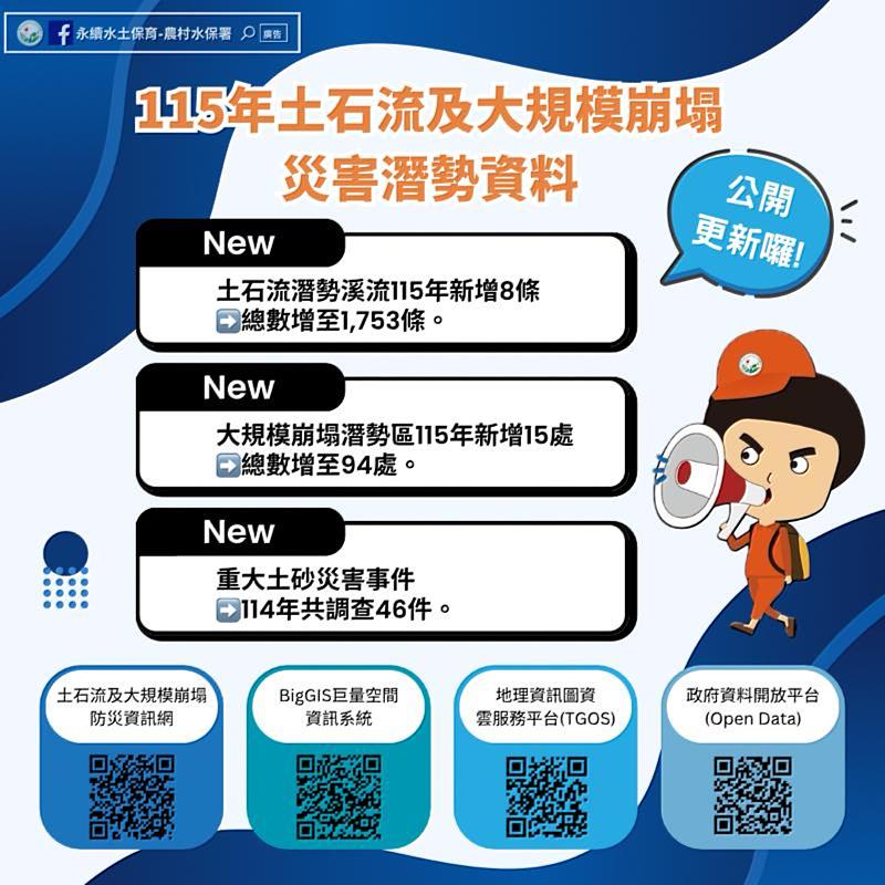 農業部農村水保署自89年7月災害防救法公布實施後,為減少災害發生及防止災害擴大,每年持續辦理調查評估,針對自然條件及保全對象等因素,分析研判可能發生土石流及大規模崩塌災害之野溪或地區,並檢討全臺土石流及大規模崩塌雨量警戒基準值,適時公開最新資訊。114年歷經丹娜絲颱風、薇帕颱風、楊柳颱風、樺加沙颱風、鳳凰颱風及0728豪雨等災害後,即刻進行新增調整及雨量警戒基準值檢討更新等作業,業經114年12月16日邀集相關機關(構)及專家學者審查確認後,更新115年全臺土石流及大規模崩塌災害潛勢資料,土石流潛勢溪流共計1,753條,其中新增計8條,分布於宜蘭縣大同鄉、新北市三芝區、南投縣埔里鎮、彰化縣二水鄉、高雄市六龜區及高雄市桃源區;大規模崩塌潛勢區共計94處,其中新增15處,分布於新北市坪林區、桃園市復興區、新竹縣五峰鄉、苗栗縣卓蘭鎮、臺中市和平區、南投縣信義鄉、嘉義縣竹崎鄉、高雄市六龜區、屏東縣三地門鄉、臺東縣海端鄉、臺東縣卑南鄉、花蓮縣萬榮鄉。