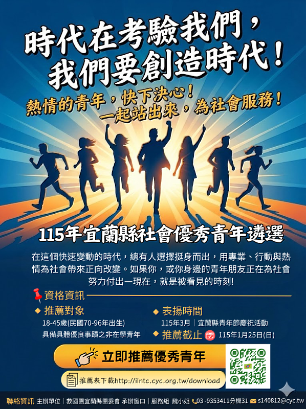 救國團宜蘭縣團委會呼籲,各機關、學校、社團及公司行號有符合資格且表現優異之青年人選,敬請把握機會,於115年1月25日(星期日)前,將推薦表及相關佐證資料寄送至救國團宜蘭縣團委會(260宜蘭市民權新路102號)。