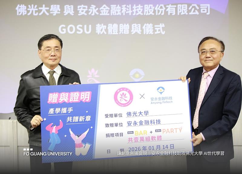 (中央社訊息服務20260116 17:04:46)安永金融科技股份有限公司(以下簡稱「安永金融科技」)與佛光大學舉辦「產學合作暨軟體贈與儀式」,由佛光大學校長趙涵捷與安永金融科技董事長劉國安共同出席見證。安永金融科技宣布贈與佛光大學1萬套GOSU軟體授權,並規劃後續工作坊與教學配套措施,協助師生將創意快速落地,推動全齡教育與校園數位行銷實作,讓更多人能在AI世代靈活運用創意,設計並執行最有趣、最有效的互動活動。