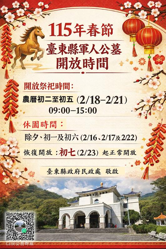 今年春節9天連續假期,臺東縣政府為服務返鄉祭祀及懷親民眾,便利家屬(眷)於農曆春節期間前往位在卑南鄉泰安村的軍人公墓祭祀,特別公告115年農曆春節開放時間,農曆初二至初五(國曆2月18日至2月21日)開放祭祀,開放時間為每日上午9時至下午3時;另於除夕、農曆初一及初六(國曆2月16日、2月17日及2月22日)休園不對外開放,自農曆初七(國曆2月23 日)起恢復正常開放。