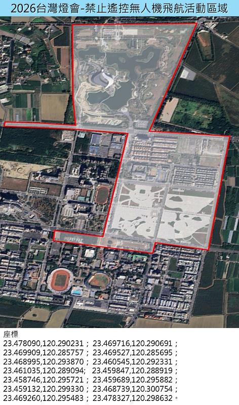 (中央社訊息服務20260119 10:02:53)2026台灣燈會將於3月3日至3月15日在嘉義縣盛大登場,相信有許多空拍機玩家已迫不及待,考量活動期間人潮眾多,基於維安及民眾參與活動安全考量,縣府建設處已於會場周邊劃設遙控無人機飛行管制區域與時間,請民眾遵守相關規範。