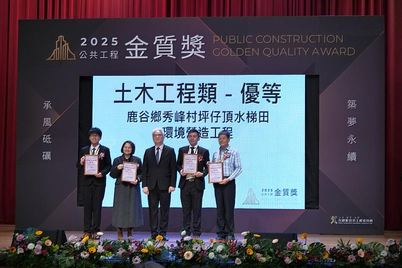 (中央社訊息服務20260121 18:27:21)在2026年首場公共工程盛事中,農業部農村發展及水土保持署團隊再次以專業與溫情溫暖了國人的心。行政院公共工程委員會今(21)日舉行「第25屆公共工程金質獎」頒獎典禮,農村水保署表現耀眼,共計抱回4件工程獎、1件維護管理獎及1個人貢獻獎。王晉倫副署長率領獲獎的分署與團隊步上紅毯,這6面獎牌背後,代表的是農村水保署對臺灣每一寸土地、每一處農村社區最深沉的守護。