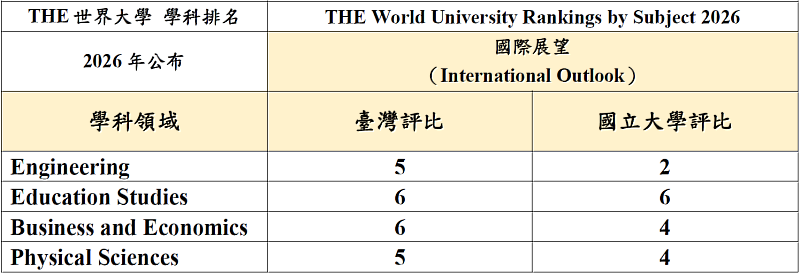 (中央社訊息服務20260122 15:19:20)英國「泰晤士高等教育(Times Higher Education)」於2026年1月21日公布THE WUR 2026世界大學學科排名(THE World University Rankings by Subject 2026),由THE WUR官方機構主導調查,評分過程嚴謹且客觀,各大學須達門檻才可入榜,國立東華大學於「工程學科(Engineering)」整體獲評全球第601-800名。其中,工程學科的「國際展望(International Outlook)」評分項目,東華此項目在臺灣入榜的34所大學中名列第5名,在國立大學名列第2名;不僅如此,東華在工程學科的「研究環境(Research Environment)」評分項目,在臺灣入榜的34所大學中名列第8名。