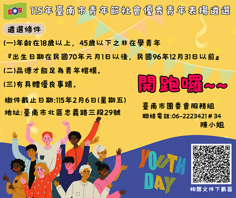 救國團臺南市團委會歡迎各界踴躍推薦,讓更多青年榜樣被看見,共同發掘具社會影響力的青年典範。社會優秀青年推薦活動實施要點暨推薦表請至:http://tnctc.cyc.org.tw/download下載,相關推薦表請於115年2月6日(星期五)前寄送至台南市團委會服務組陳輔導員彙整(台南市北區忠義路三段29號),電話:06-2223421轉34,Email:s240106@cyc.tw。遴選結果將公告於台南市團委會官網(http://tnctc.cyc.org.tw/)及「台南市救國團」FB粉絲專頁。