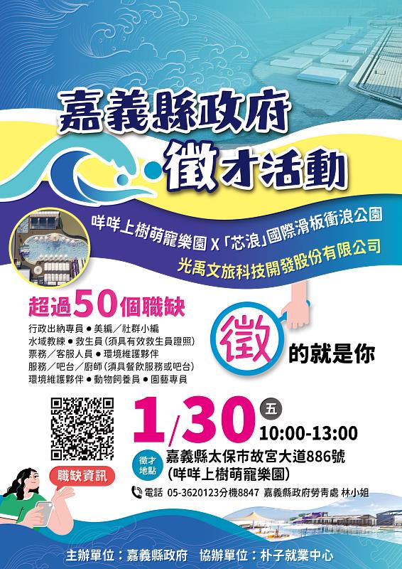 (中央社訊息服務20260124 14:30:10)嘉義縣政府將在1月30日(五)上午10點至下午1點舉辦「咩咩上樹萌寵樂園 X 芯浪國際滑板衝浪公園」徵才活動,提供超過50個工作機會,工作地點位於故宮南院周邊的「咩咩上樹萌寵樂園」,歡迎有興趣的求職者前往參加。