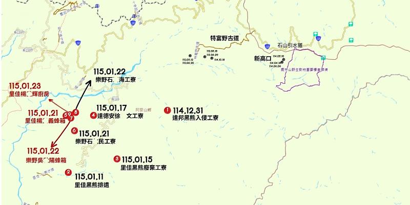 前於1月3日黑熊四度光臨達邦工寮後,陸續於里佳菜園、工寮發現熊的蹤跡與排遺,17日接獲達邦達德安地區徐君通報,工寮有一只原木蜂箱遭拖行、破壞啃食,嘉義分署透過紅外線相機監測於18日拍攝到黑熊影像,該熊左眼後有白斑,經專家研判應與3日發現為同一隻黑熊,依據前幾次經驗,將食源收妥黑熊即不再現蹤。至21日於里佳及樂野日野賀鄰近地區同日接獲2起黑熊啃食蜂箱,研判黑熊於該處徘徊,嘉義分署22日即設置2只誘捕籠,以水果、龍眼蜜、天然野蜂蜜等吸引物持續進行誘捕,掌握臨近工寮及蜂箱分布狀況,並借重嘉義縣鄒族獵人協會獵人的山林智慧合作追蹤熊跡,規劃於成功誘捕後移地野放,避免黑熊侵擾聚落。