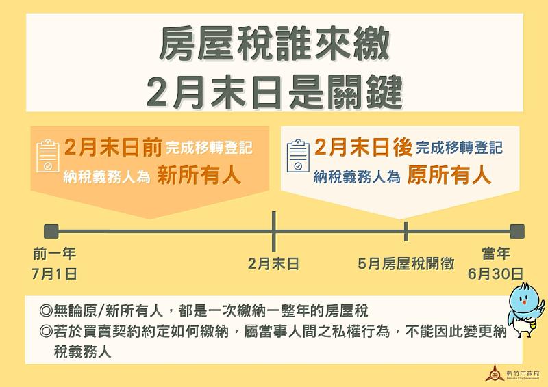 (中央社訊息服務20260129 14:01:25)房屋稅於每年5月開徵,如當年度有出售房屋,該由誰繳納房屋稅?新竹市稅務局提醒,依據《房屋稅條例》第6條之1規定,每年2月末日為房屋稅納稅義務基準日,由當地主管稽徵機關按房屋稅籍資料核定當年度房屋稅納稅義務人,如在2月末日前完成移轉登記,新所有權人持有雖未滿一年,仍為全年房屋稅納稅義務人,如超過2月末日才移轉登記者,則由原所有權人為納稅義務人。