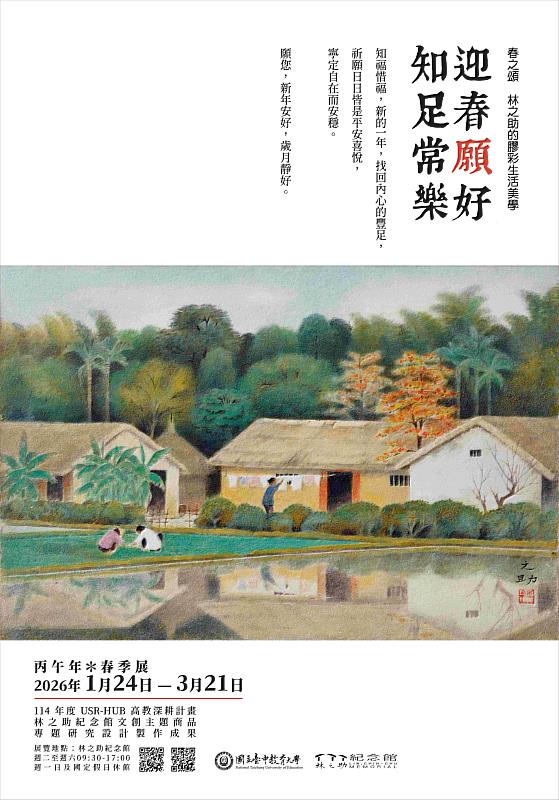 (中央社訊息服務20260130 14:26:19)丙午馬年喜逢新年,臺中教育大學林之助紀念館年度春季展特別推出「『迎春願好,知足常樂』2026春之頌.林之助的膠彩生活美學」展覽活動,此次展出內容包括精選林之助膠彩典藏數位版畫作品,同時共同推廣展示「大學社會責任實踐USR-Hub計畫」114年度林之助紀念館文創主題商品專題設計製作成果。