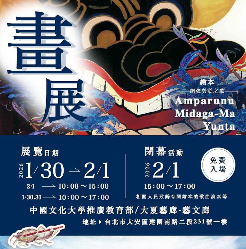 (中央社訊息服務20260130 16:00:39)以歌聲、勞動與自然共生為主題的繪本原畫展《Amparunu Midaga-Ma Yunta》,將於即日起至2月1日在中國文化大學推廣教育部大夏藝廊・藝文廊溫暖展出,邀請喜愛藝術、繪本、日本文化與自然議題的民眾,一同前往觀賞。
