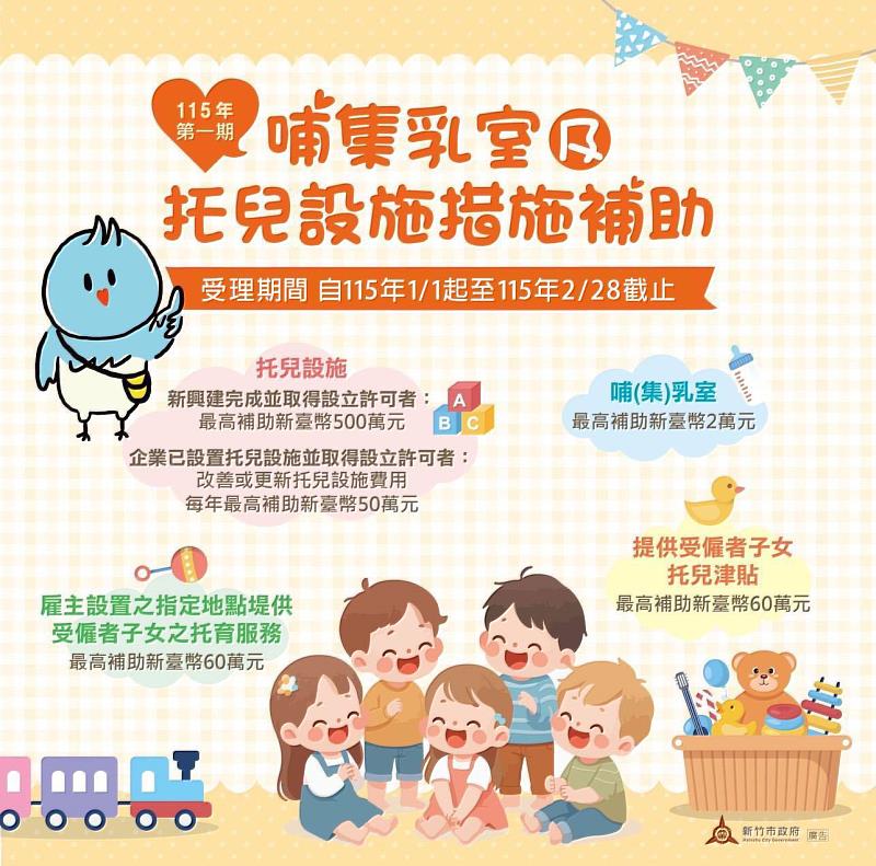 勞工及青年處提醒,為簡化事業單位申請流程並提供更便捷的服務,勞動部已增訂得以線上方式提出補助申請,115年起有意願申請之事業單位可至企業托兒與哺(集)乳室資訊網填寫申請書表,並於即日起至2月28日,以線上申請或掛號郵寄方式提出申請。若事業單位對於申請流程或補助細節有任何疑問,歡迎電洽勞動部免付費服務專線1955,或洽詢新竹市政府勞工及青年處諮詢電話:03-5324900。