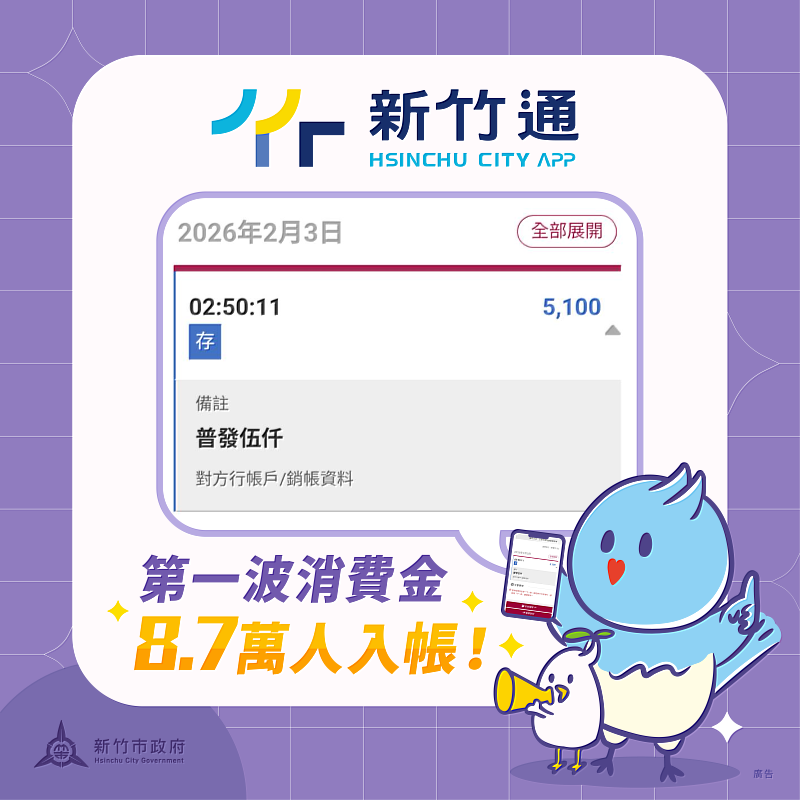 (中央社訊息服務20260203 17:34:10)新竹市政府發放振興經濟5,000元消費金,新竹通數位申請已於1月30日8時開放登記,今(3)日首波入帳,並鼓勵數位應用加碼100元,共計8.7萬名市民喜迎5,100元;市長高虹安表示,此次市府發放消費金提供多元管道,並結合數位科技,落實智慧治理。數位登記將持續開放至2月28日,尚未申請的市民朋友可透過「新竹通」APP 輕鬆登記。
