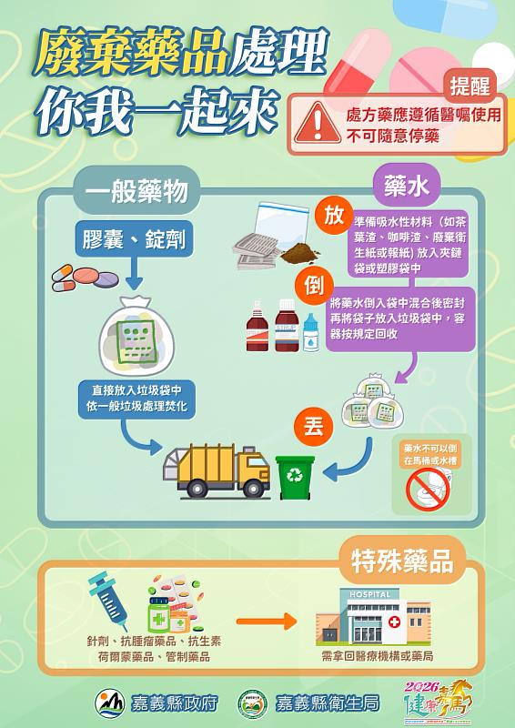 同時,對於過期、變質或已完成療程的藥品,若屬針劑、抗腫瘤藥品、抗生素、荷爾蒙藥品或管制藥品等特殊藥品,應交由醫療機構或藥局回收,避免不當處理造成環境污染或健康危害;一般藥品則可隨一般垃圾焚化處理,液態藥品則可依「放、倒、丟」三步驟,將吸水材料放入塑膠袋後倒入藥水密封,再丟入垃圾袋處理,共同落實用藥安全與環境保護。