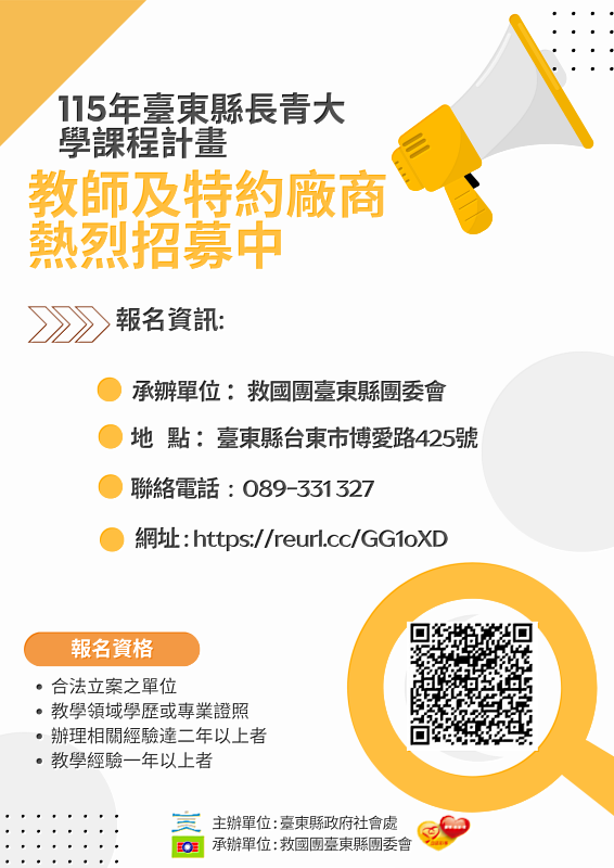 為打破社會對高齡生活的刻板印象,推動「專業、創新、共好」的銀髮教育,臺東縣政府社會處辦理之長青大學現正公開招募教學師資及特約合作廠商,對象除教師外,亦包含健身房、個人工作室等各領域且具專業服務能量之單位。只要所開課程願意讓長者加入一同上課,且人數達到一定規模,就可以向社會處提出申請,成為長青大學的課程師資並領取課程補助款,每堂課最高可補助1,000元,希望能讓長輩能有更多課程選擇。申請期間自即日起開始,誠摯邀請各界具備熱忱、創意與專業技術的夥伴加入,共同為銀髮族打造豐富且多元的學習地圖,攜手勾勒嶄新的熟齡生活藍圖。