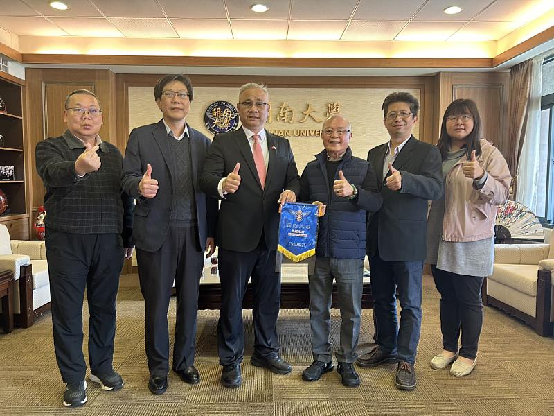 (中央社訊息服務20260206 09:45:27)開南大學5日下午在校內貴賓室舉行校務顧問歡迎會,隆重迎接新聘校務顧問、總統府國策顧問及日本台灣後援會會長陳天隆蒞校指導。董事會主任秘書兼副校長陳文甲代表董事長顏志光與校長郭鐘達親自接待,主任秘書黃建宏、人事主任吳福輝、國際長陳泰源及境外生服務中心主任李依玲等人共同出席,展現學校對推動台日教育合作與國際化發展的高度重視。