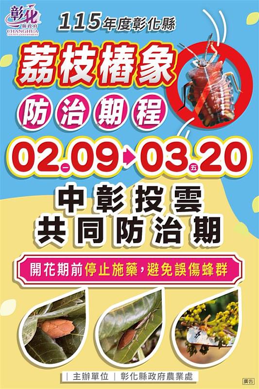 (中央社訊息服務20260210 11:55:31)115年度荔枝椿象防治工作,彰化縣政府自行編列預算採購防治藥劑,提供農友最實質支援。日前由農業部動植物防檢署邀集縣府農業處、農試所、台中改良場等單位,經會勘後訂定中彰投雲地區化學共同防治期程為115年2月9日至3月20日,縣府將全力支持農友進行聯合防治,確保荔枝椿象防治工作不中斷。
