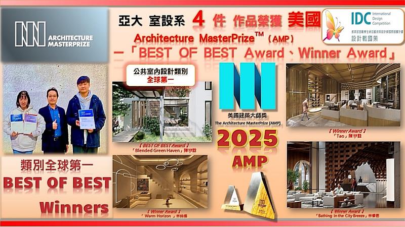 (中央社訊息服務20260210 16:28:39)亞洲大學室內設計系學生參加「Architecture MasterPrize™(AMP)」, 4件作品獲Winner首獎,其中一件更榮獲公共室內設計類別全球第一「BEST OF BEST」獎。