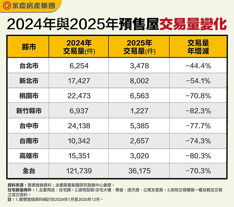 在央行信用管制續行、房貸條件嚴峻的影響下,2025年預售屋市場買氣明顯降溫。永慶房產集團比較2024年與2025年七大都會區和全台預售屋交易狀況發現,全台預售屋交易量從12.2萬件大幅下滑至3.6萬件,年減幅高達70.3%,顯示預售市場進入明顯的量縮階段,購屋族進場態度趨於保守。