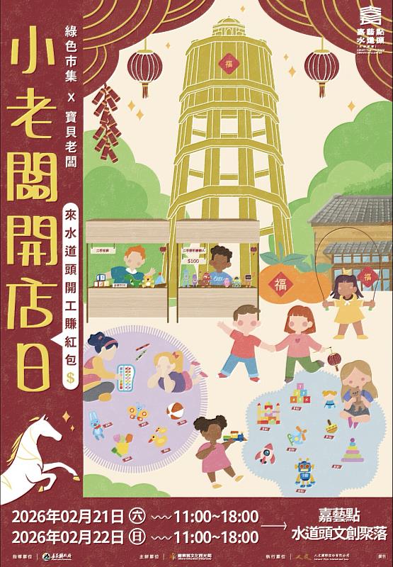 (中央社訊息服務20260211 17:17:14)嘉義縣文化觀光局將於2月21、22日(星期六、日)在朴子市嘉藝點水道頭文創聚落舉辦「小老闆開店日」市集活動,讓小朋友幫自己的「舊愛」找到珍惜它的「新歡」,並藉由這次活動為新春連假畫上一個完美的句點。
