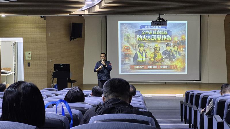 消防局針對賽事核心提供「115年全中運競賽場館防火及應變作為」專題演練,詳細介紹場館動線規劃、火災初期撲滅及疏散引導流程,確保實現「賽事不中斷,安全不妥協」的目標。