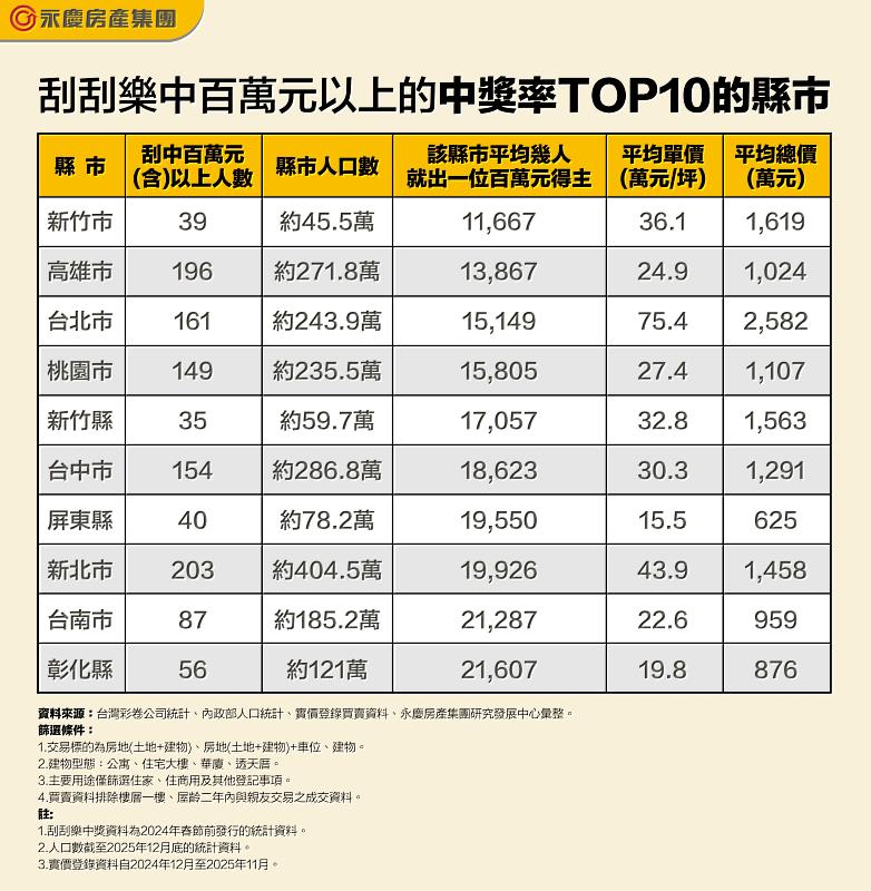 永慶房產集團根據台灣彩券公司銷售統計,統計2024年刮刮樂春節前後中百萬元(含)以上獎項的縣市,發現新竹市中獎率居冠,平均不到12,000人就能出一位百萬得主,高雄市、台北市雖然居住人口很多,但刮中百萬獎項的中獎率也很高,分居全台的亞、季軍。
