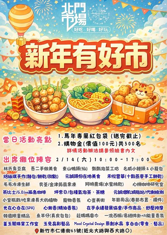 (中央社訊息服務20260213 13:46:50)為迎接農曆新年熱鬧氛圍,新竹市北門市場將於2月14日10時至17時舉辦「新年有好市集」活動,產發處表示,此次活動結合在地美食、手作品牌與限量優惠好康,透過充滿年節氣息的市集,邀請市民朋友走進傳統市場,體驗濃厚的人情味與新春喜氣,為新的一年開啟好彩頭。