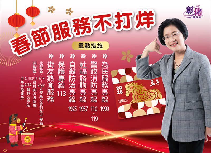 (中央社訊息服務20260213 14:16:23)喜逢春節福臨門,彰化縣長王惠美縣府團隊感謝全縣鄉親這一年來對縣政的支持。縣府於春節期間持續提供各項「不打烊」的福利服務,包含「春節關懷情、溫暖遊民心」行動,春節期間定期發放熱食、弱勢學生幸福餐券不停歇、長照送餐服務不中斷,以及為民服務專線「1999」、警政消防專線「110、119」、社會福利諮詢專線「1957」、自殺防治專線「1925」與保護專線「113」等多元管道,透過單一窗口諮詢服務,提供民眾即時必要的關懷與協助。